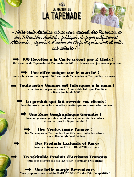 Montrez à vos clients que vous choisissez avec GRAND SOIN vos producteurs et que vous SOUTENEZ L'ARTISANAT FRANCAIS - " LA MAISON DE LA TAPENADE "